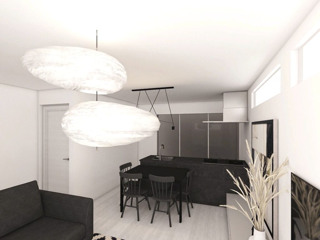 中古マンションを購入され、リノベーションを希望されたご夫妻。都会的でスタイリッシュな空間を望まれるお好みに合わせ、インテリアはモノトーンで統一。現代アートを愛されるご夫妻のため、作品が際立つよう壁面の色や照明にもこだわりました。