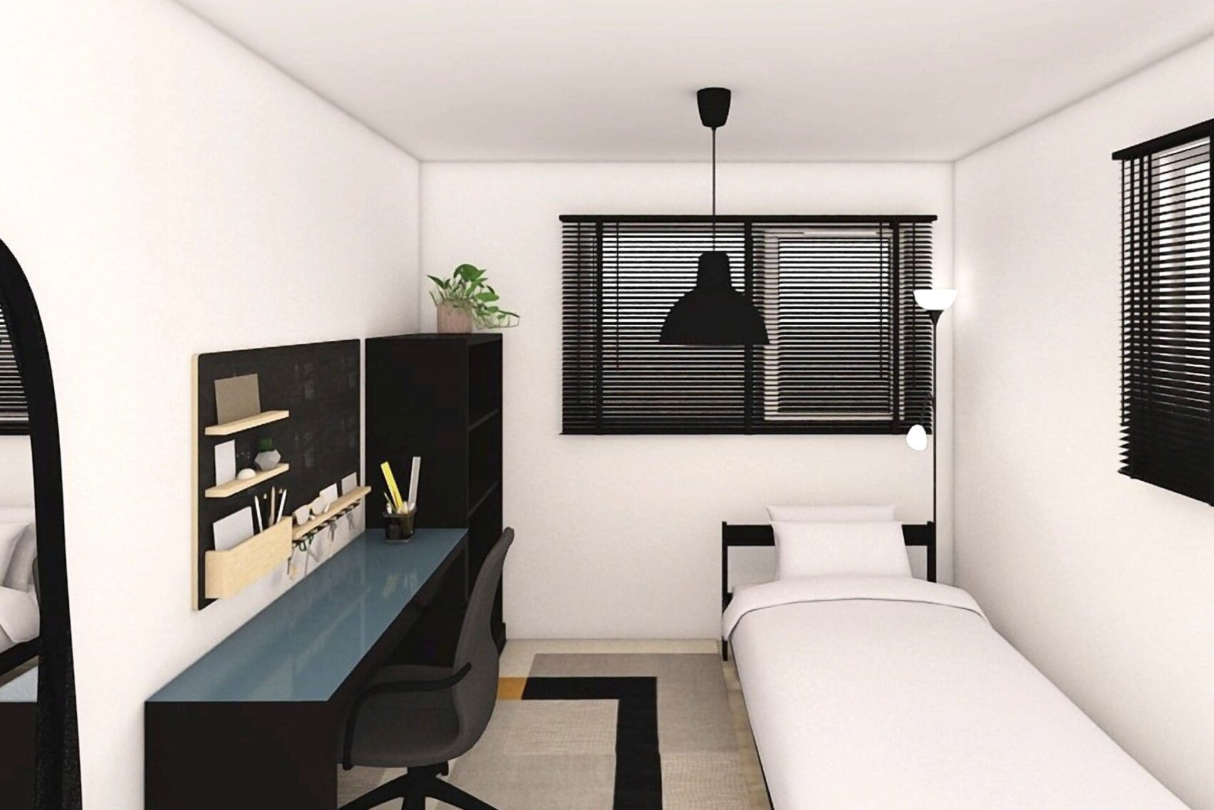 自宅の子供部屋の検討です。IKEAやニトリなどの低価格帯の家具を取り入れ、コストを抑えながらもスタイリッシュに仕上げた子供部屋です。白い壁をベースに、家具や窓まわり、照明をブラックでまとめることで空間にメリハリを演出。さらに、ポイントで色味を加えることでアクセントとなり、シンプルながらも個性のある雰囲気が生まれました。
