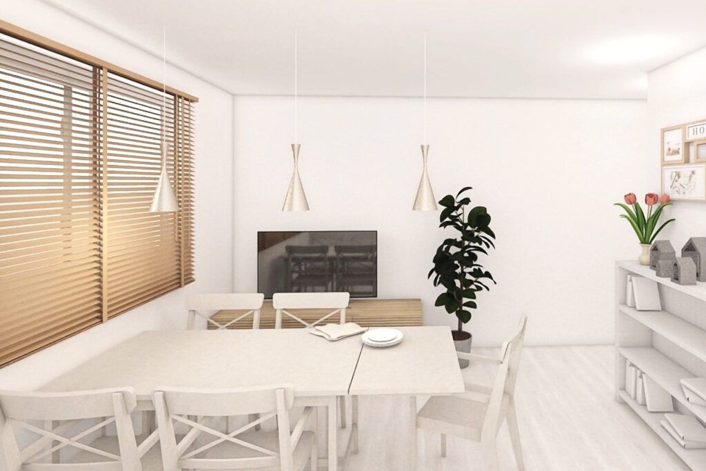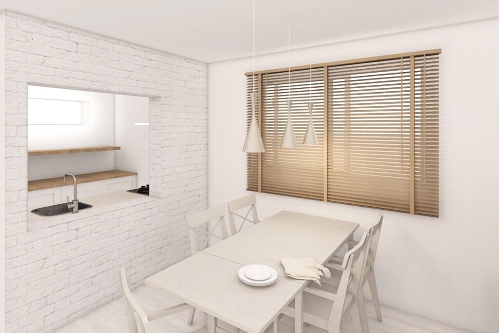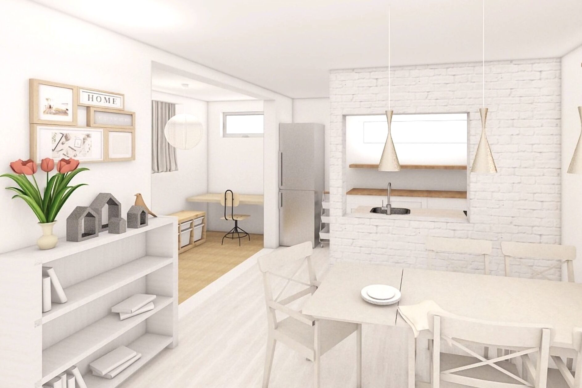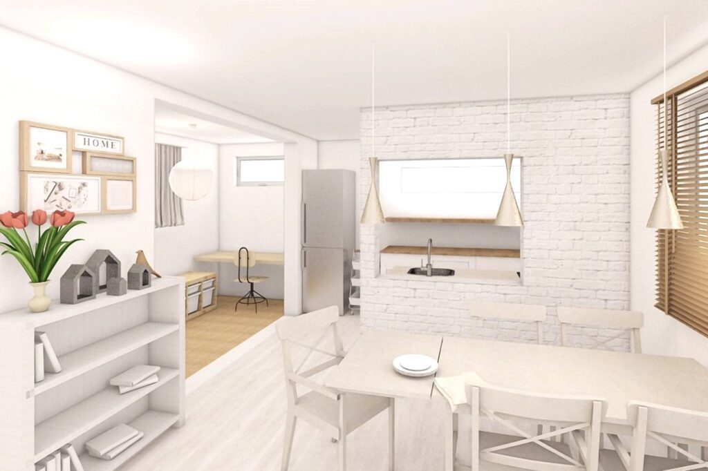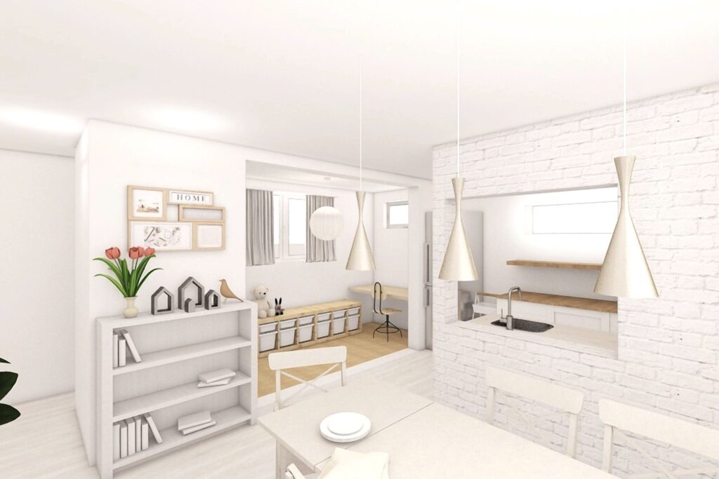セミオープンのキッチンを中心としたLDKは、北欧スタイルを基調にしたシンプルで温かみのある空間。経年で汚れが気になっていたキッチンの壁には、レンガ調の遊び心あるクロスを採用し、空間に程よいアクセントを添えました。照明はゴールドを選び、ブラインドには木調のものを取り入れることで、シンプルながらも上質さを感じさせるデザインに仕上げています。