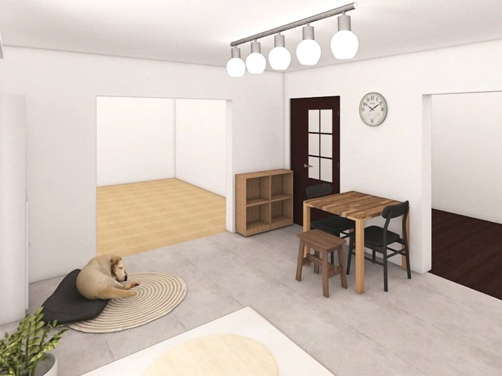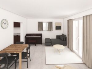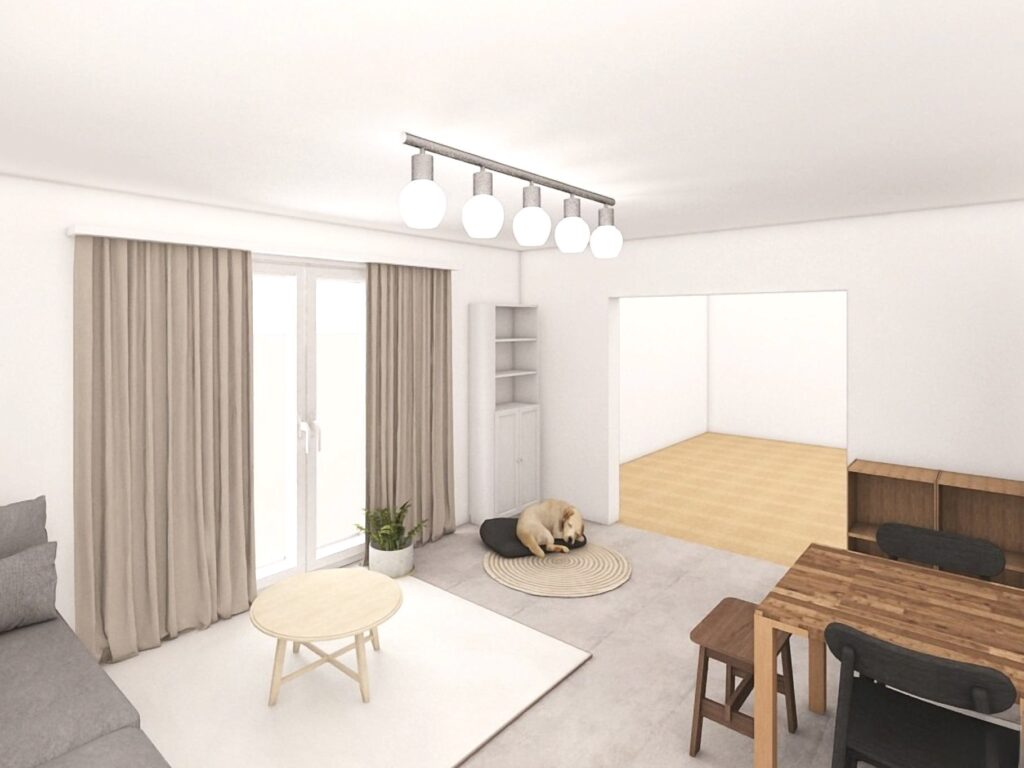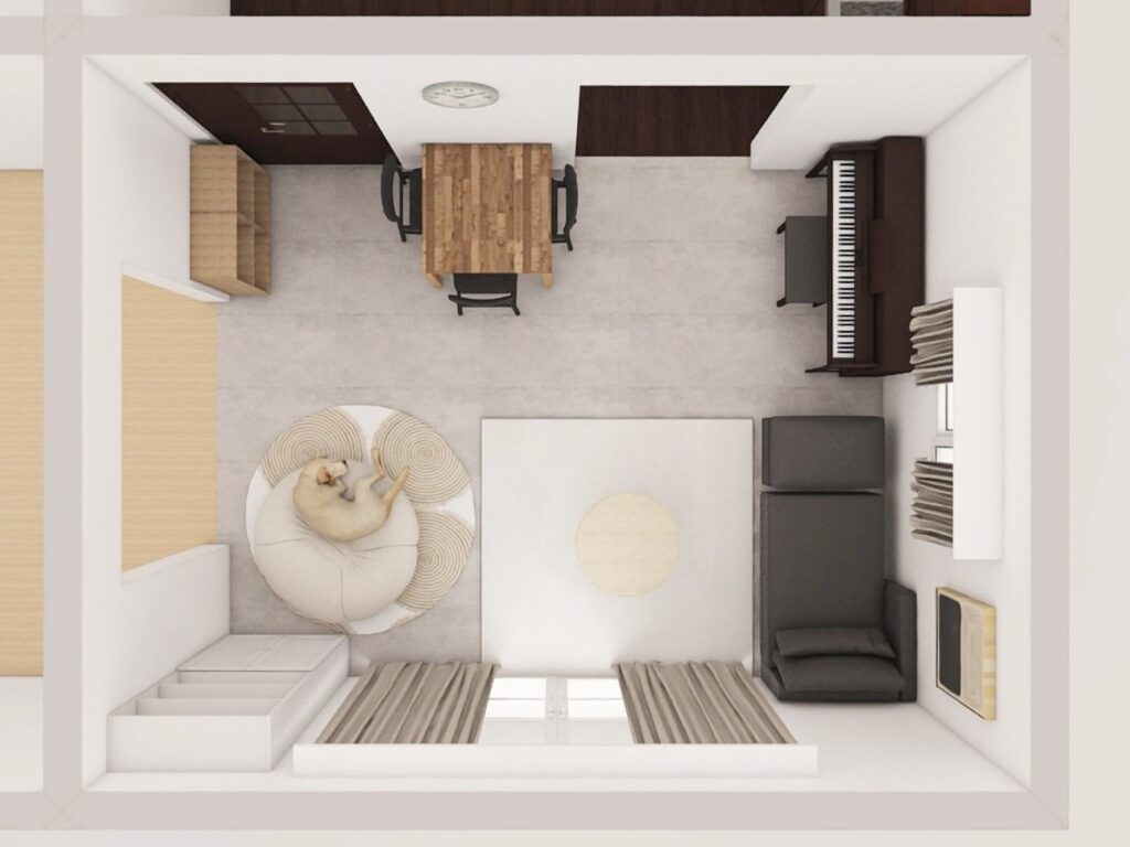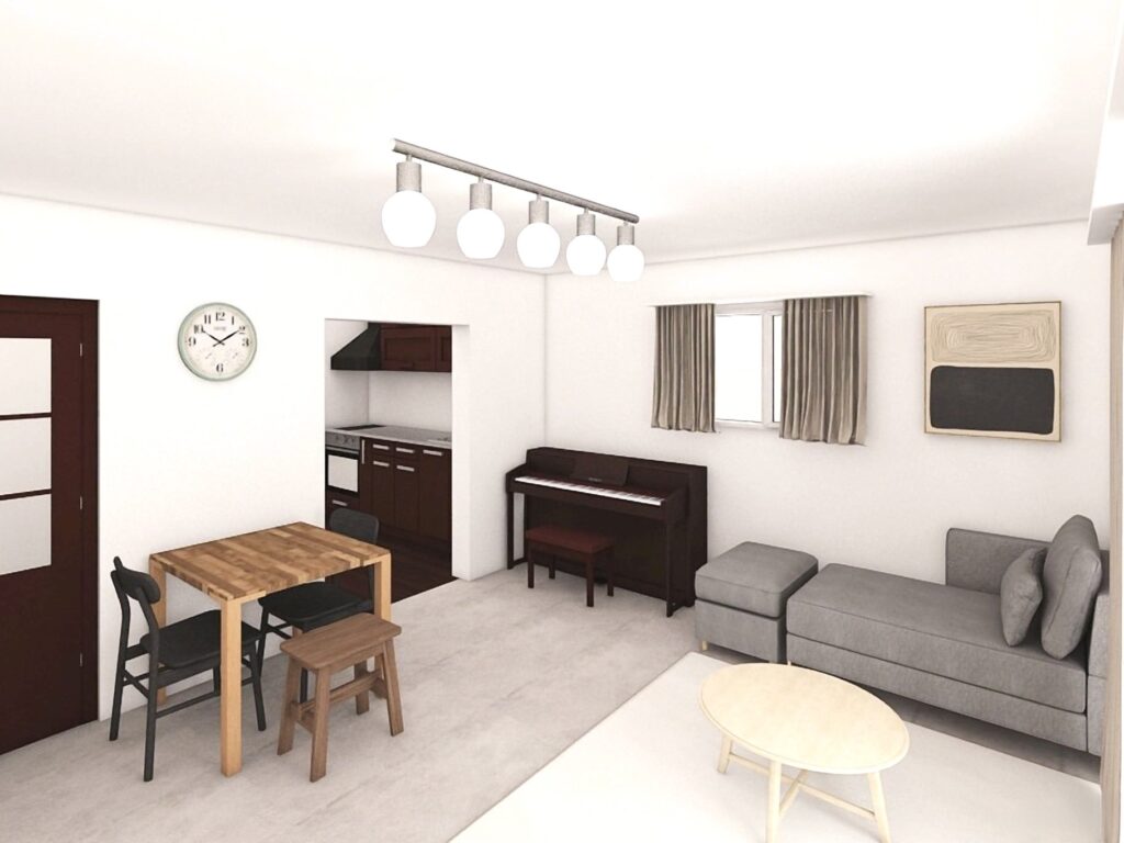 南向きの窓から光が差し込むリビングは、建具やピアノの深みある色合いが空間に趣を添え、どこか懐かしさを感じさせます。⼀⽅で、お使いの家具やカーテンの選び⽅からは、明るさと軽やかさを⼤切にされていることが伝わってきました。そこでご提案したのが、両⽅の魅⼒を調和させる「ナチュラルレトロモダン」スタイルです。レトロな質感を活かしつつ、やさしい色合いのファブリックや自然素材を取り入れることで、落ち着きと洗練をあわせ持つ心地よい空間に。冬の冷たい床には、見た目にも温かみを感じられるラグや低めの家具を取り入れることで、家族がくつろげる快適な居場所に整えられます。大きな家具を増やさずとも、光と素材の調和で「今の暮らしにちょうどいい」リビングが実現します。