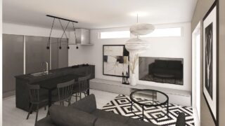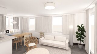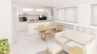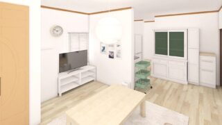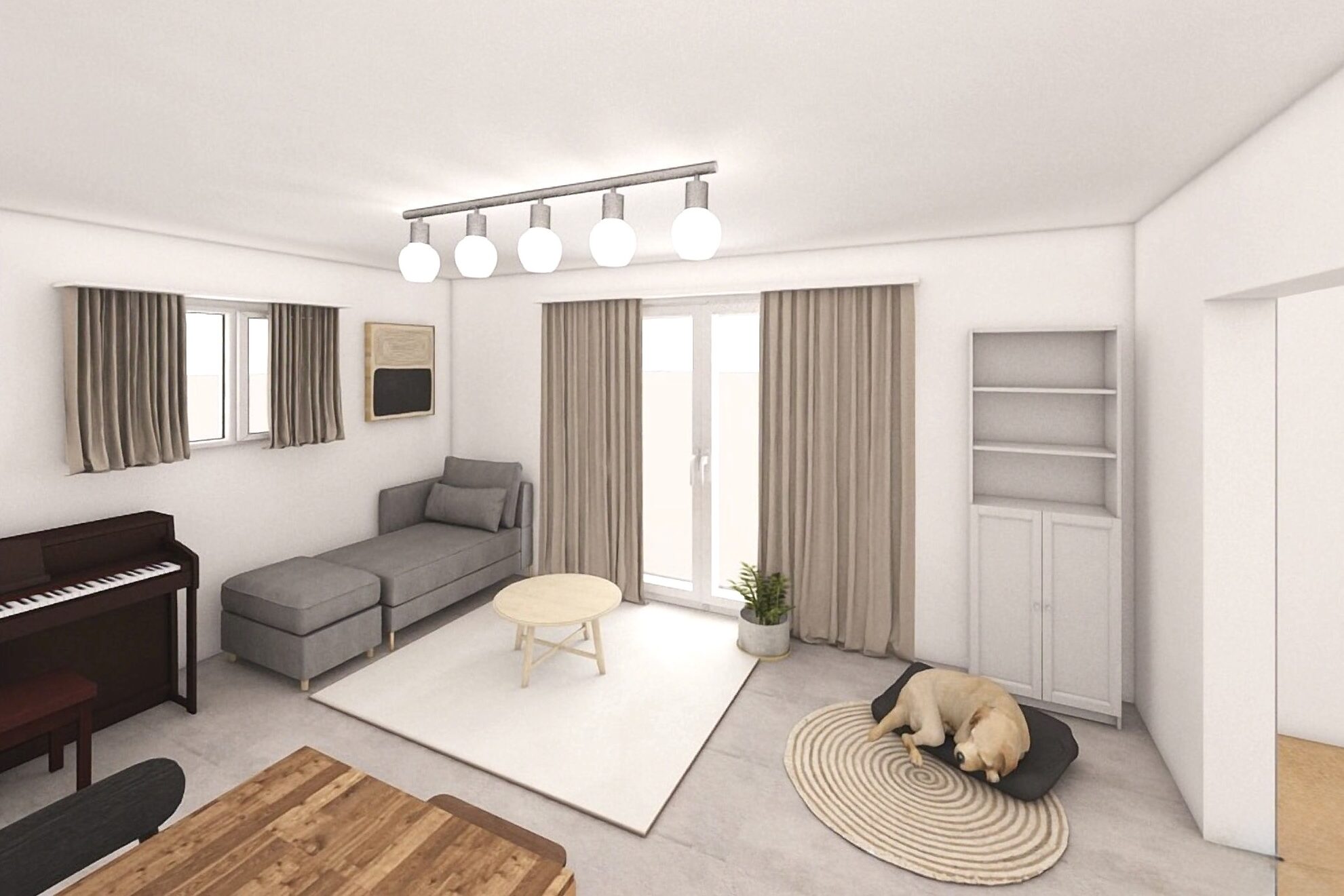 南向きの窓から光が差し込むリビングは、建具やピアノの深みある色合いが空間に趣を添え、どこか懐かしさを感じさせます。⼀⽅で、お使いの家具やカーテンの選び⽅からは、明るさと軽やかさを⼤切にされていることが伝わってきました。そこでご提案したのが、両⽅の魅⼒を調和させる「ナチュラルレトロモダン」スタイルです。レトロな質感を活かしつつ、やさしい色合いのファブリックや自然素材を取り入れることで、落ち着きと洗練をあわせ持つ心地よい空間に。冬の冷たい床には、見た目にも温かみを感じられるラグや低めの家具を取り入れることで、家族がくつろげる快適な居場所に整えられます。大きな家具を増やさずとも、光と素材の調和で「今の暮らしにちょうどいい」リビングが実現します。