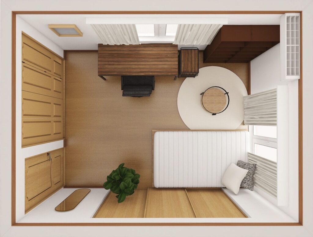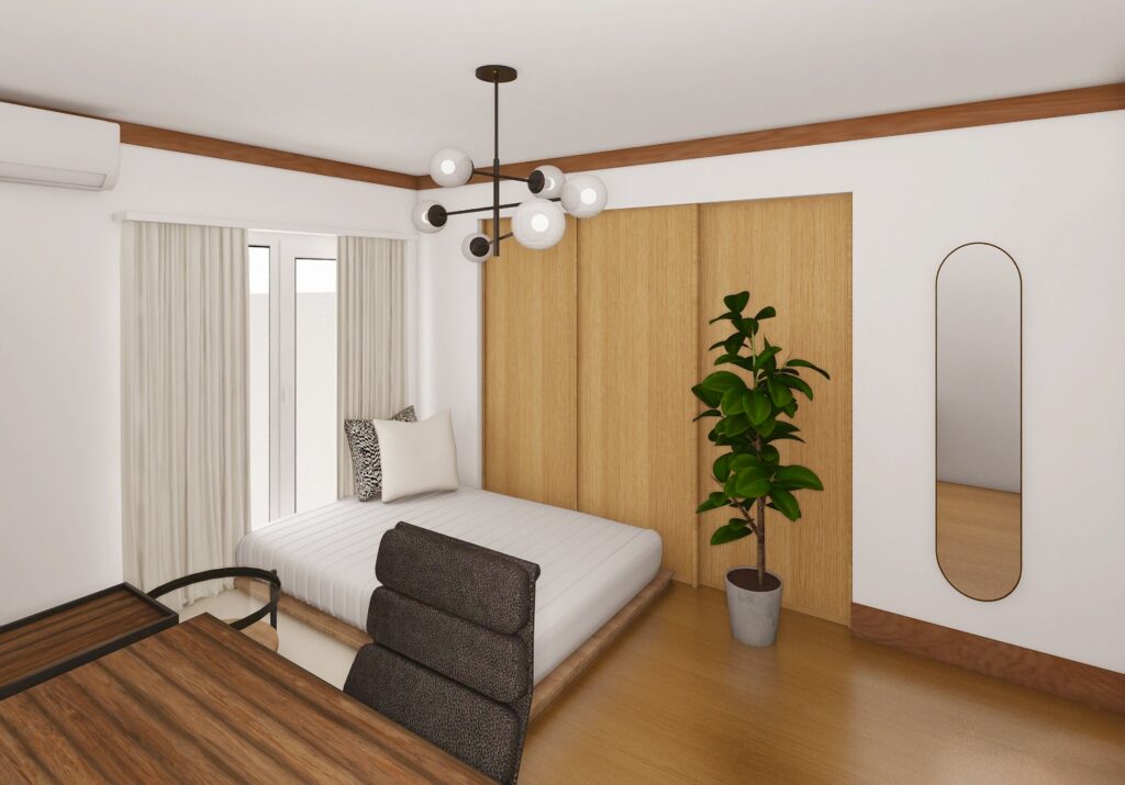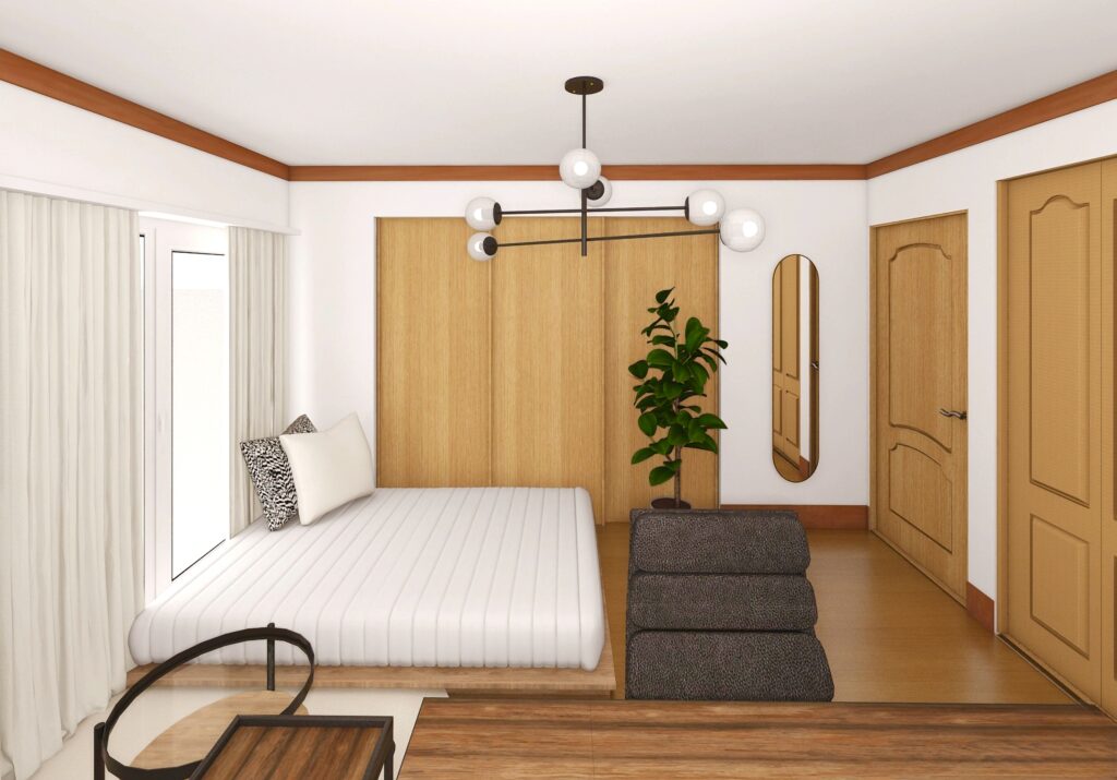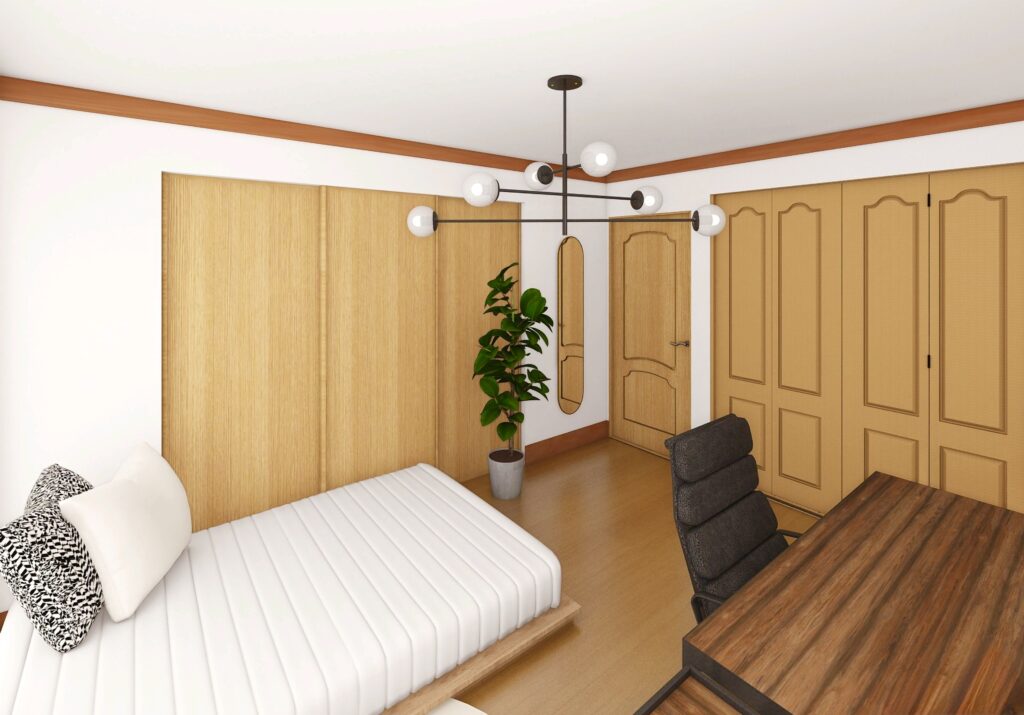 今まで一人暮らしをされていたN様は、一時的にご実家にお住まいで在宅ワーク中心の生活を快適にしたいというご希望がありました。そこで、床や建具、本棚など異なるトーンの木材を活かしつつ、北欧らしい温かみとモダンなシンプルさを両立。色数を抑えてすっきりと見せ、クッションや小物でアクセントを加えることで、落ち着きの中にも心地よい変化が感じられる空間に仕上げています。また、趣味が楽しみづらい状況を改善するため、整理収納のアドバイスも行いました。既存の素材を活かし統一感を出すことで、仕事も趣味も快適に過ごせるお部屋に。家具も将来的にお引越しされても転用しやすいデザインを選び、機能性とデザイン性を両立させることで、暮らしの変化にも柔軟に対応可能です。小さなスペースでも、居心地の良さと使いやすさを両立できるよう配慮しました。
